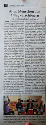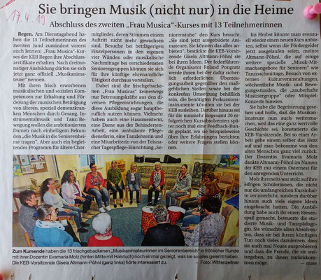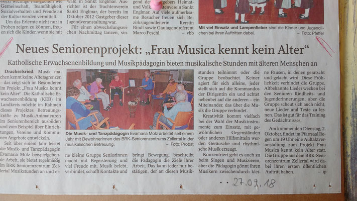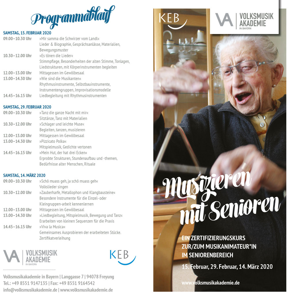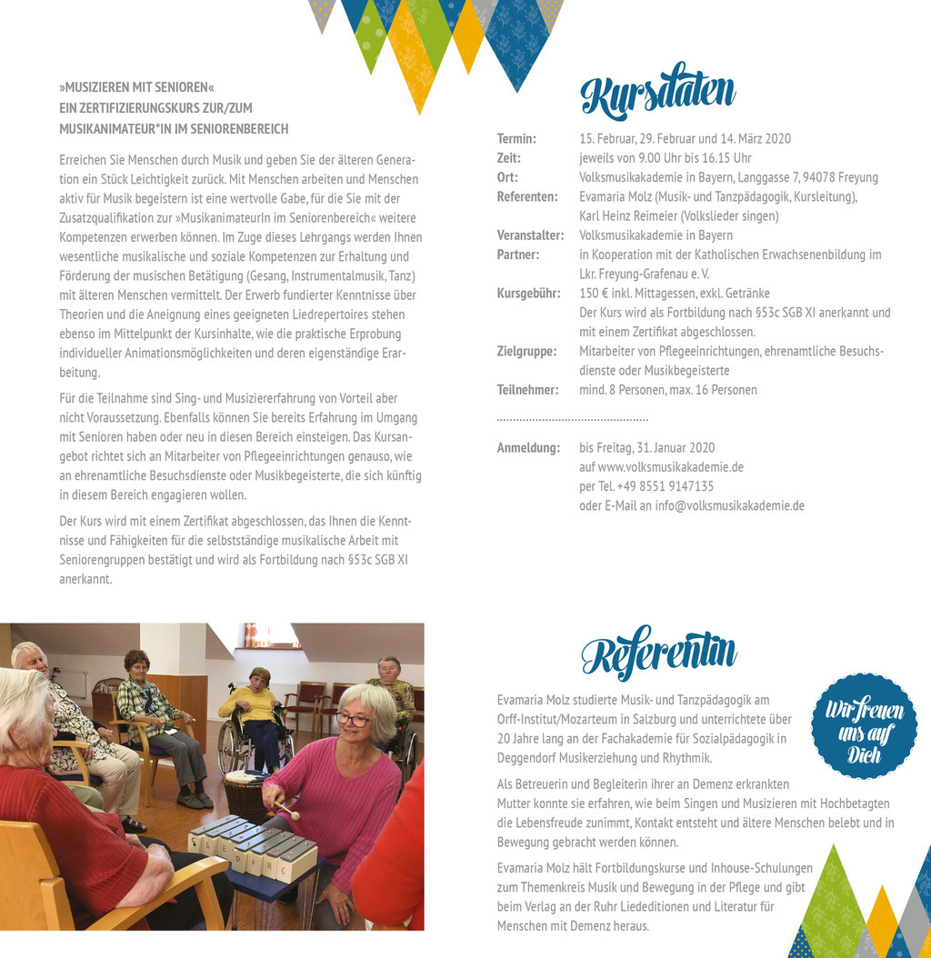 Im Rahmen des Projekts "Frau Musica kennt kein Alter" unter der Trägerschaft der Katholischen Erwachsenenbildung im Landkreis Regen (https://www.keb-regen.de/) habe ich einen Lehrgang entwickelt, in dem musikbegeisterte Menschen das Handwerkszeug zum Musizieren mit betagten Menschen erlernen können.
