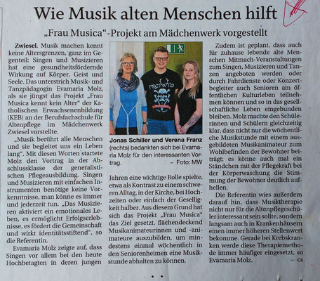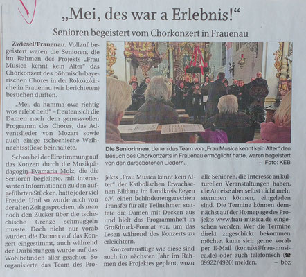 Das Projekt "Frau Musica kennt kein Alter" ist im Jahr 2018 von der Katholische Erwachsenenbildung im Lkr. Regen e. V. ins Leben gerufen worden. Neben der Ausbildung von "MusikanimateurInnen im Seniorenbereich" entstanden vielfältige musikalische Angebote für SeniorInnen und Hochbetagte wie begleitete Konzertbesuche und regelmäßige musikalische Mitmachangebote. Gefördert wurde dieses Projekt, das Ende 2020 ausgelaufen ist, vom Kulturfonds Bayern, dem Landkreis Regen und dem Bezirk Niederbayern.