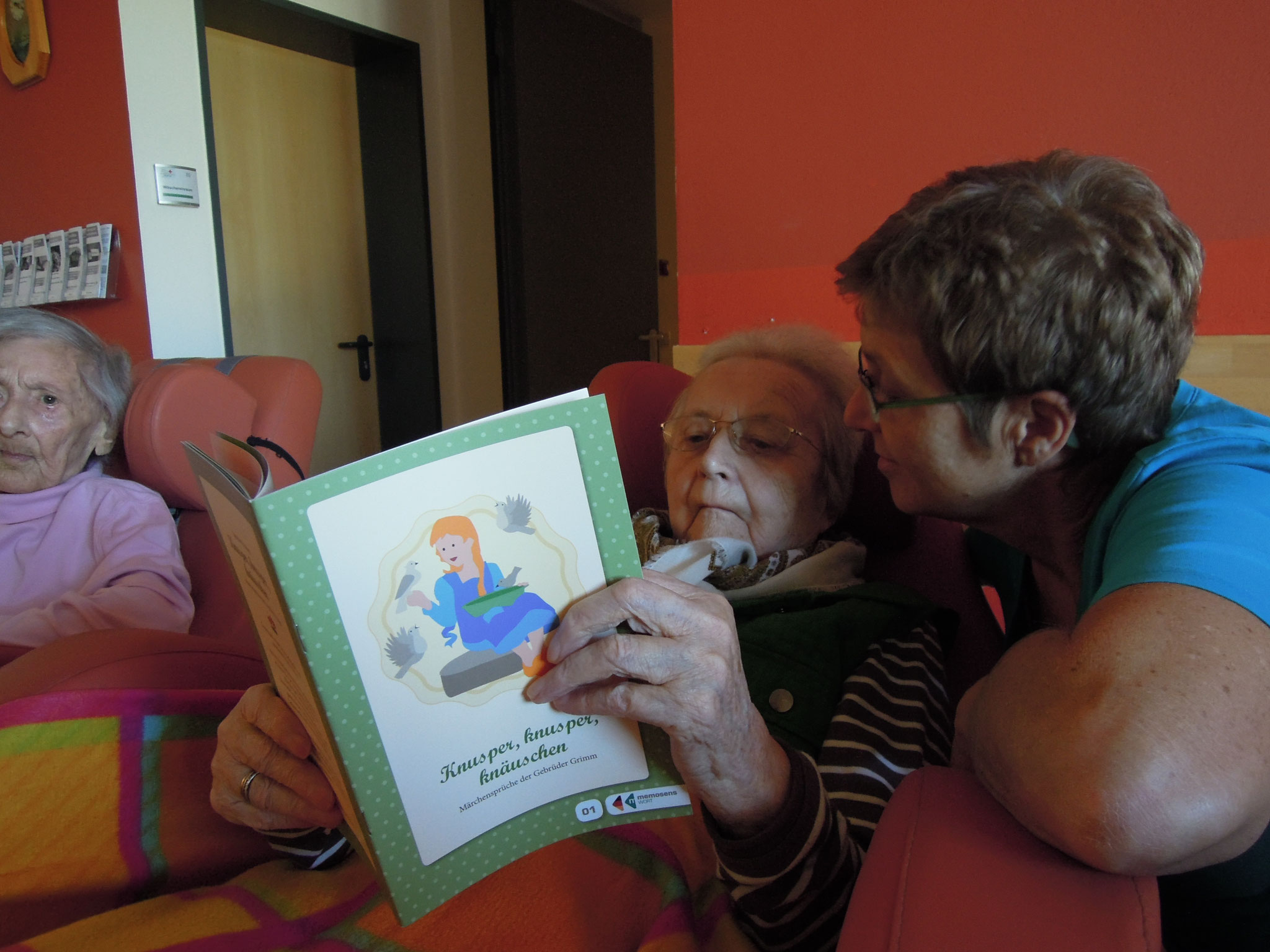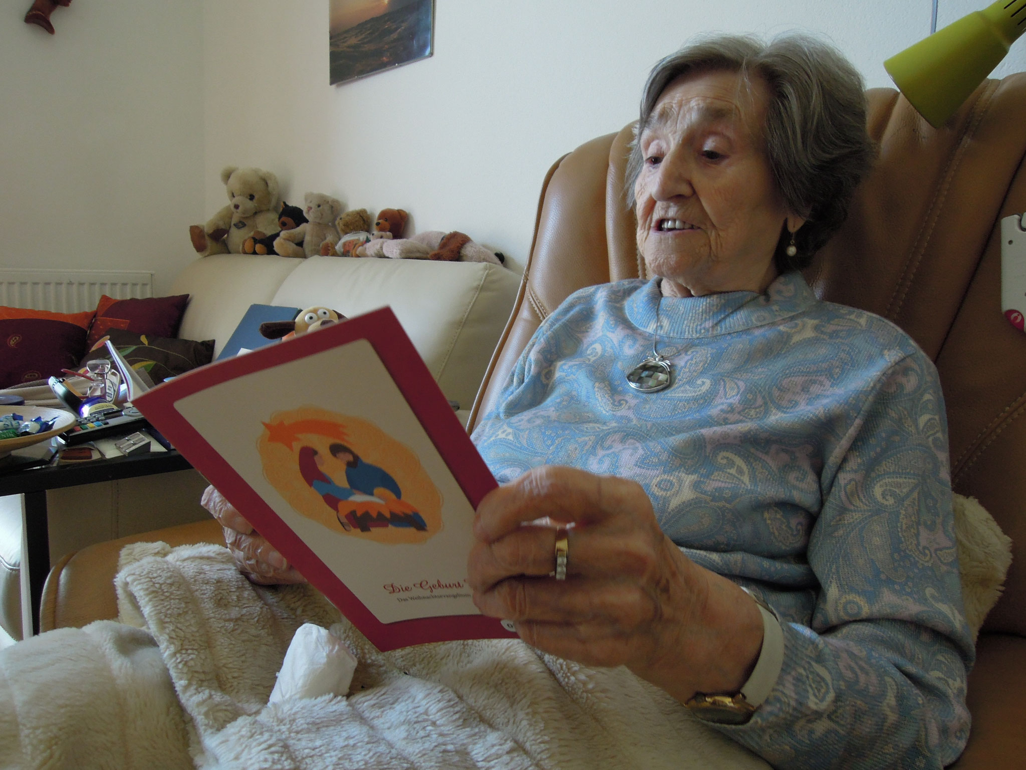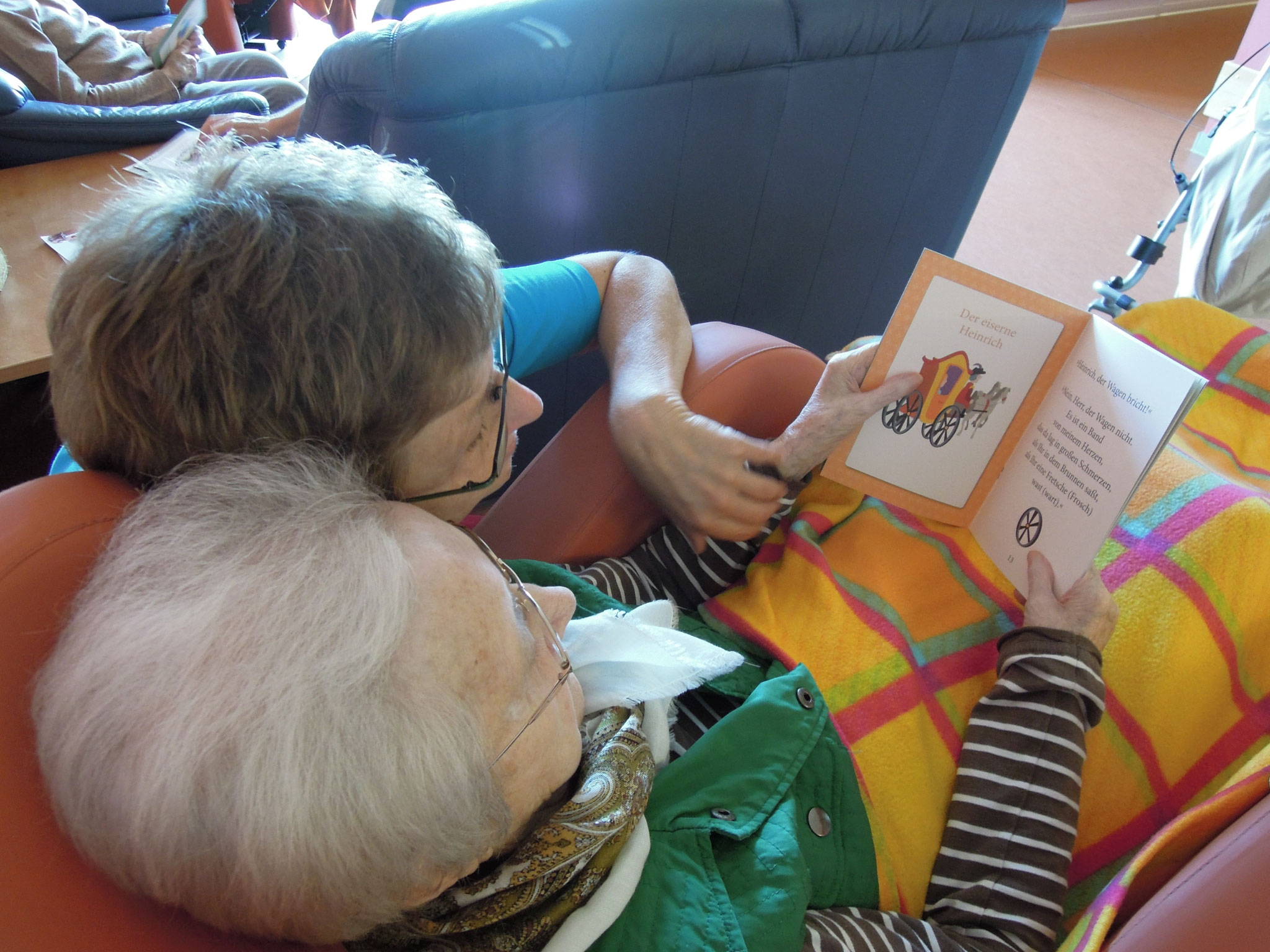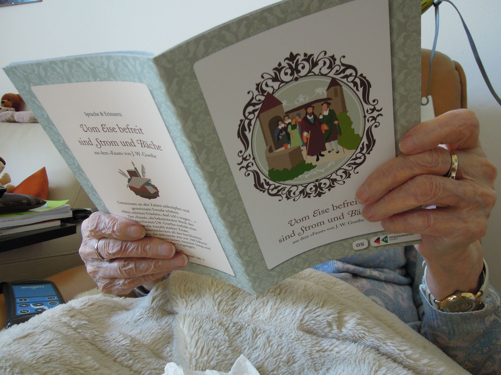 Ich wünschte mir, dass meine Mutter auch dann eine anregende und erfüllte Zeit haben sollte, wenn ich nicht für sie da sein konnte. Kommunikation wurde zunehmend schwierig, da sie gesprochene Sprache nicht mehr gut verstand und sich auch selber immer weniger ausdrücken konnte. Aber sie las gerne. Und ich sorgte für Lesestoff, indem ich ihr bekannte Texte, wie zum Beispiel alte Briefe oder Gedichte vergrößert kopierte. Damit konnte sie sich stundenlang alleine beschäftigen. Oft lasen wir gemeinsam: Immer wieder die selben Texte, die sie zum Teil dann deklamierte, abwandelte, fortsetzte.